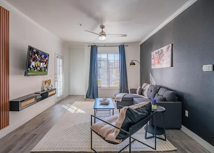 O Deluxe 1Bd King Bed Pool, Hot Tub, Gym, Parking Apartamento Glendale de 92 m² está localizado a 10 minutos de carro de Camelback Ranch e a aproximadamente 3 km de Estádio da Universidade de Phoenix. Os hóspedes podem usar Wi-Fi tanto para fins de negócios quanto de lazer.